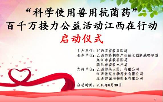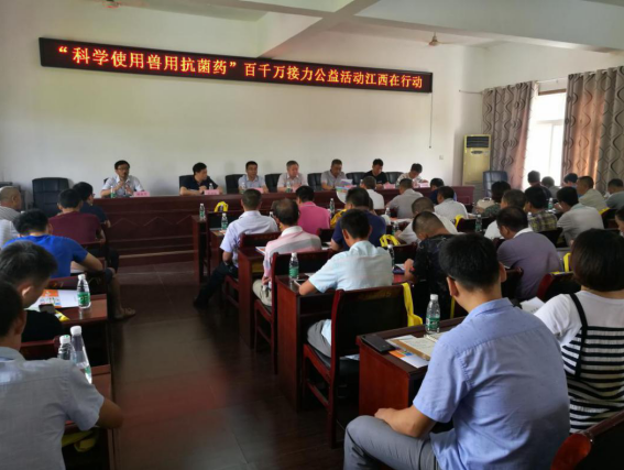 為響應(yīng)全國“科學(xué)使用獸用抗菌藥”百千萬接力公益行動(dòng),2018年8月30日,由江西省畜牧獸醫(yī)局主辦,江西獸藥制劑產(chǎn)業(yè)技術(shù)創(chuàng)新戰(zhàn)略聯(lián)盟、九江市畜牧獸醫(yī)局、瑞昌市畜牧水產(chǎn)局承辦,江西博萊大藥廠有限公司、江西派尼生物藥業(yè)有限公司、江西邦誠動(dòng)物藥業(yè)有限公司協(xié)辦的江西省“科學(xué)使用獸用抗菌藥”百千萬接力公益行動(dòng)啟動(dòng)儀式在瑞昌市舉行。江西省畜牧獸醫(yī)局醫(yī)政藥政處黎建華處長、九江市畜牧獸醫(yī)局張付華局長應(yīng)邀參加活動(dòng),瑞昌市畜牧獸醫(yī)技術(shù)人員、養(yǎng)殖場負(fù)責(zé)人等80余人參加了此次啟動(dòng)儀式。
